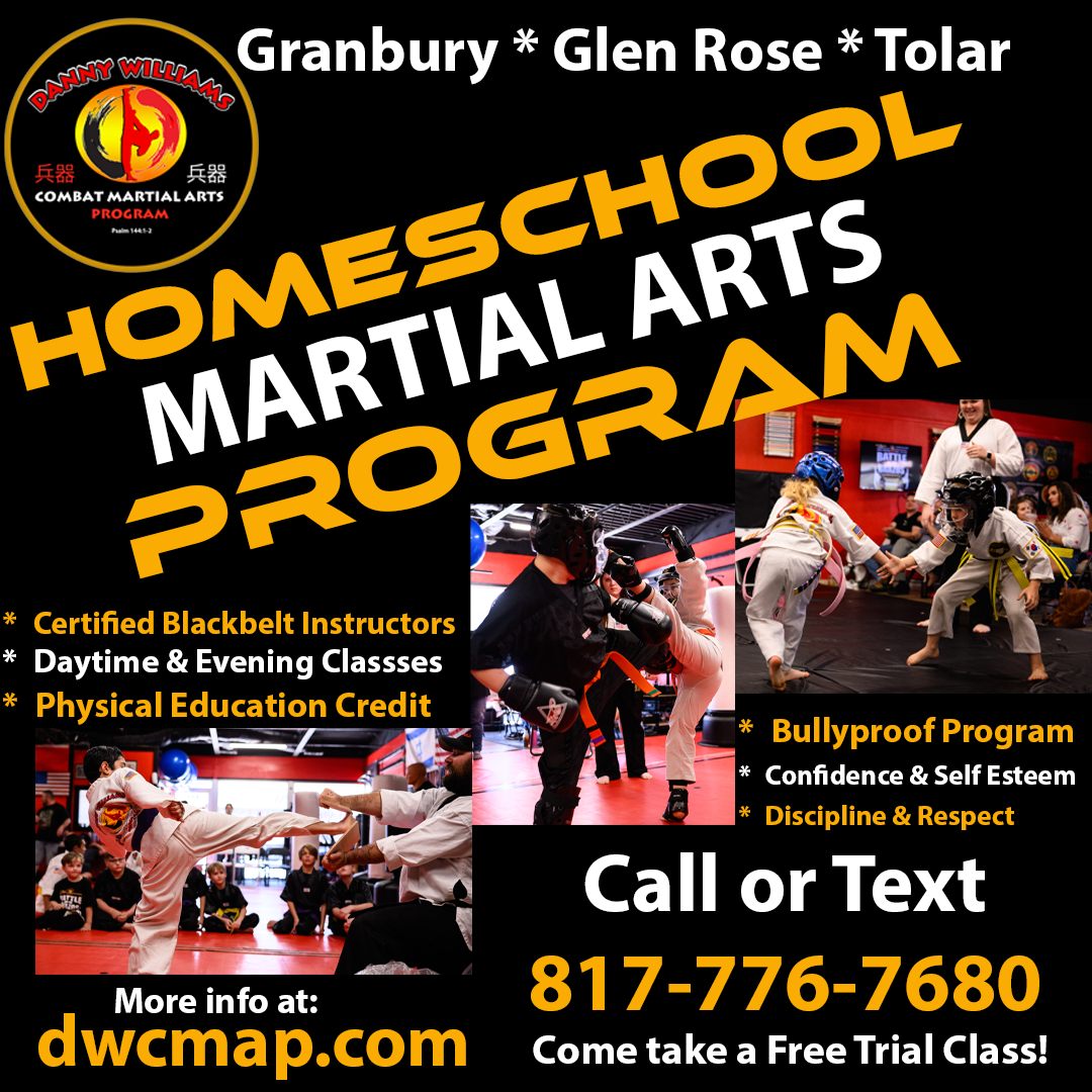 Beginner level martial arts training, self-defense and physical conditioning (Ages 6-18): The Homeschool Program accommodates most scheduled classes. This “Beginner Kid's/Youth Program” every Monday and Wednesday at 3:00 PM is a 45-minute class, with a curriculum that focuses on building confidence and coordination as well as discipline, respect, courtesy, integrity, perseverance, indomitable spirit, and self-control.